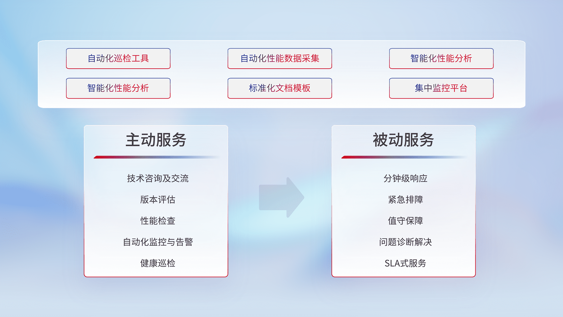 智能化工具和标准化文档,,,,保障服务质量,,,,提供主动服务(包含技术咨询、、、版本评估、、、、性能检查、、、、自动化监控与告警、、健康巡检)和被动服务包含(分钟级响应、、、紧急排障、、、、值守保障、、、问题诊断解决、、、SLA服务)。。